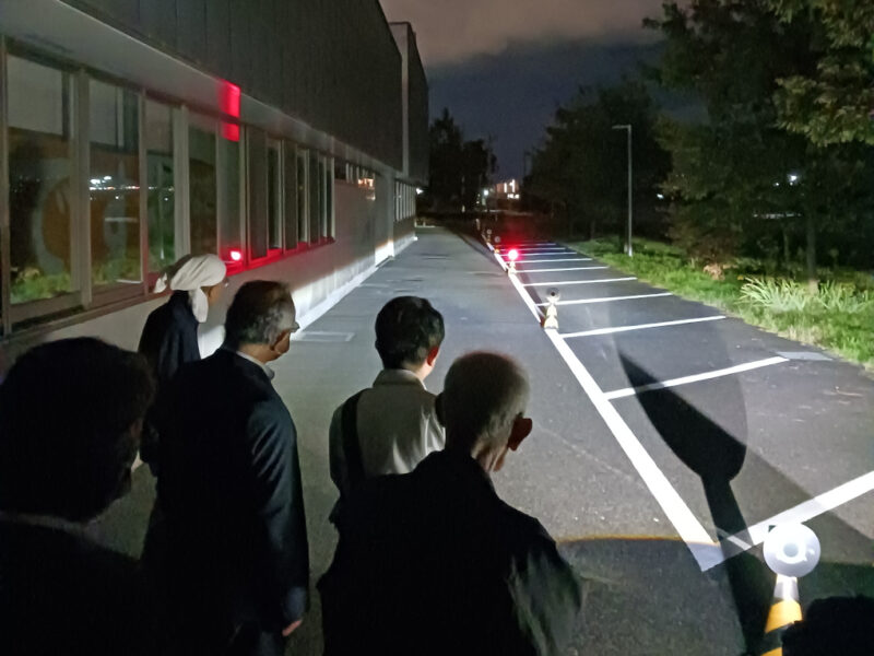 そこで、歩行者の服装などの色や反射材の有無によってドライバーからどのように見えるのか、ヘッドライトのロービーム、ハイビームで視認距離がどれくらい違ってくるのかを体験させてもらいました。